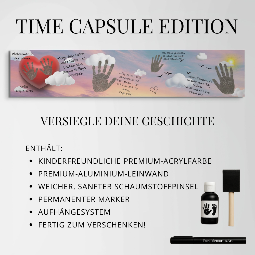 TIME CAPSULE COLLECTIONIN DER TIME CAPSULE EDITION — BEWAHRE DIE ABDRÜCKE, WORTE UND MEILENSTEINE VON HEUTE AUF EINER WUNDERSCHÖNEN PREMIUM-ALUMINIUM-LEINWAND AUF. EIN FAMILIENSCHATZ.